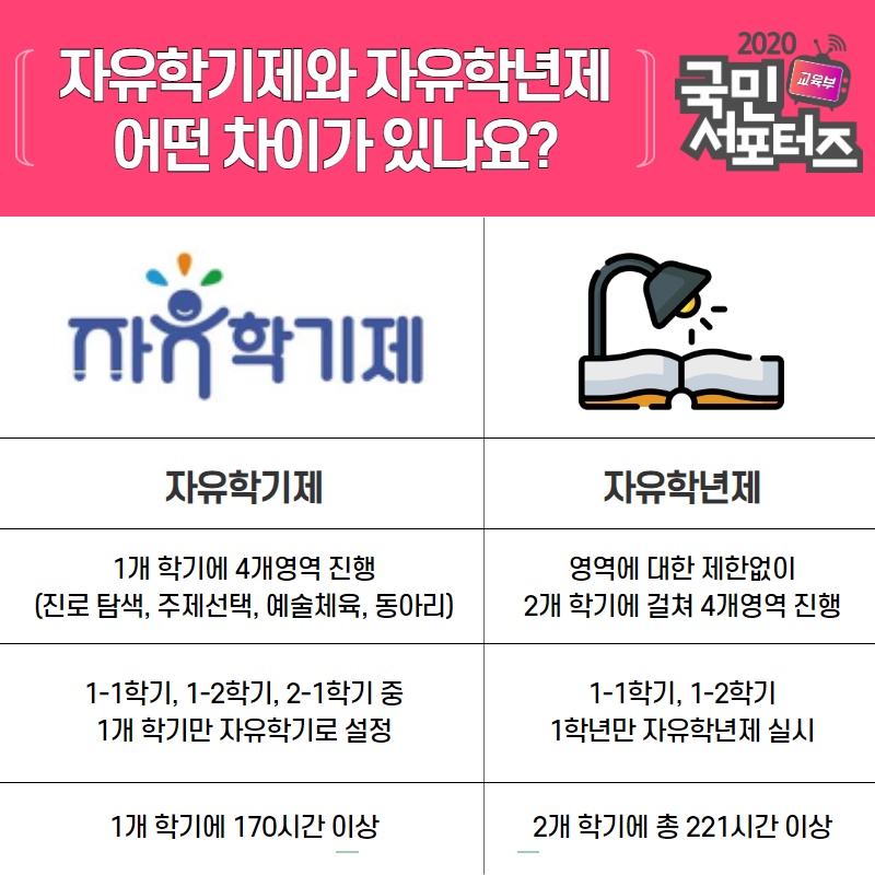 학기 설정도 다릅니다. 자유학기제는 1-1학기, 1-2학기, 2-1학기 중 1개 학기만 자유학기로 설정할 수 있는 반면 자유학년제는 1-1학기와 1-2학기 2개 학기 모두 자유학기로 설정해 1학년만 자유학년제를 실시합니다.