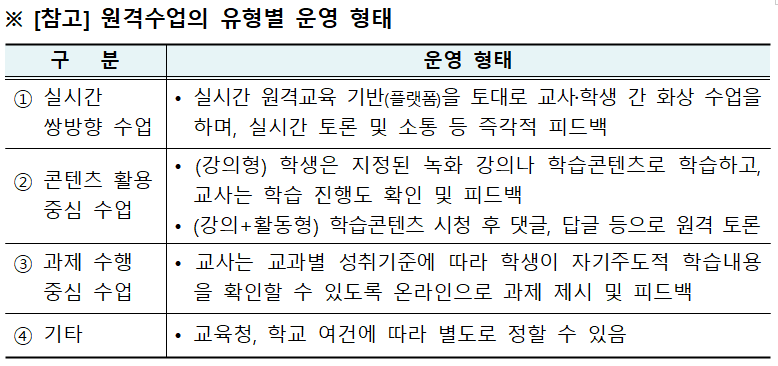 ① 원격수업의 운영 방식은 학교와 학생의 여건에 따라 △실시간 쌍방향 수업, △콘텐츠 활용 중심 수업, △과제 수행 중심 수업, △그 밖에 교육감ㆍ학교장이 인정하는 수업 등으로 다양하게 할 수 있다. 이때 학교는 학생의 학습권 보장을 위해 ‘단위수업시간’에 준하는 적정 학습량을 확보하고, 학습 결손이 발생하지 않도록 교과의 핵심개념을 중심으로 학습 내용을 제공한다.