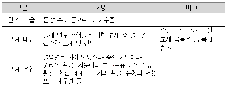 4. EBS 수능교재 및 강의와 연계하여 출제하되, 교육과정에서 중요하게 다루고 있는 개념과 원리 중심의 연계 출제를 강화함.