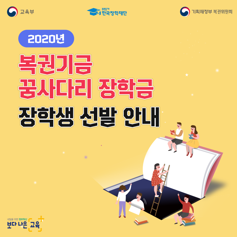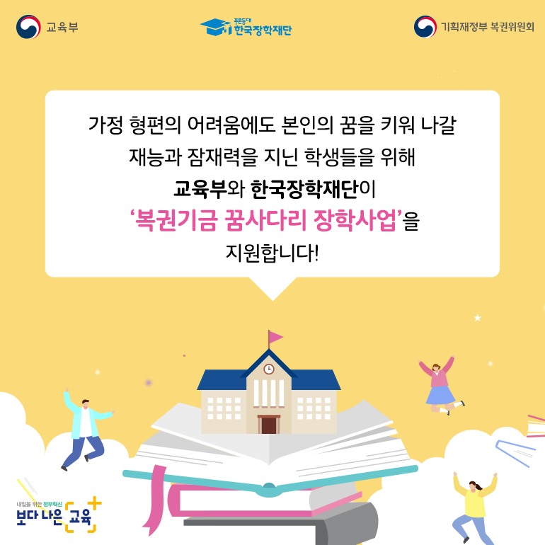 어려움에도 꿈을 키워 나갈 재능과 잠재력을 지닌 학생들을 위해 #교육부 와 #한국장학재단 이 복권기금 꿈사다리 장학사업을 지원합니다🤝