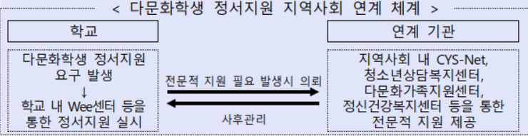 또, 교육뿐 아니라 정서 지원까지도 제공하고 있습니다. 지역사회 내 다문화 아동·청소년 지원 기관(지역사회 청소년통합지원체계, 청소년 상담복지센터, 정신건강복지센터 등)과 연계하여 학교 내 정서지원이 필요한 학생에 대한 전문 지원을 강화하고 있습니다.