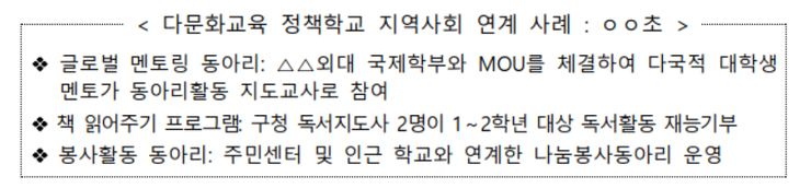 그리고 교육국제화 특구(경기도 시흥·안산)와 연계하여 교육격차 해소를 위한 지자체 연계사업을 운영하고 있는데요. 특구 내에서는 초·중등교육법 제23조(교육과정 등) 및 제29조(교과용 도서의 사용)를 적용받지 않는 학교를 운영할 수 있기 때문에 교육과정에서 자율성을 확보하여 다문화 학생을 위한 맞춤형 교육이 실시될 수 있다고 합니다.