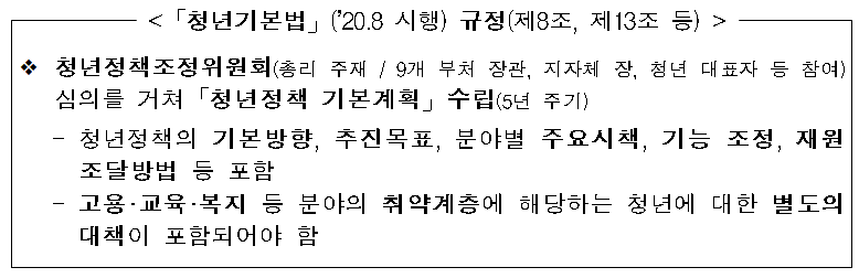 취약계층(장애, 탈북, 저소득 등) 대학생의 현황조사 및 지원방안 모색 등 「청년정책 기본계획」 수립(‘20.11 예정)을 위한 사전준비