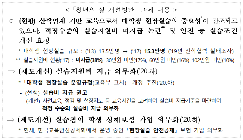 ▶ ‘20.1 마련한「대학생 현장실습 제도개선 방안」(시안)을 토대로 대학 현장의견을 수렴 중이며 의견수렴 결과 및 관계부처 실무협의를 거쳐 ‘20년 하반기 중 확정·발표