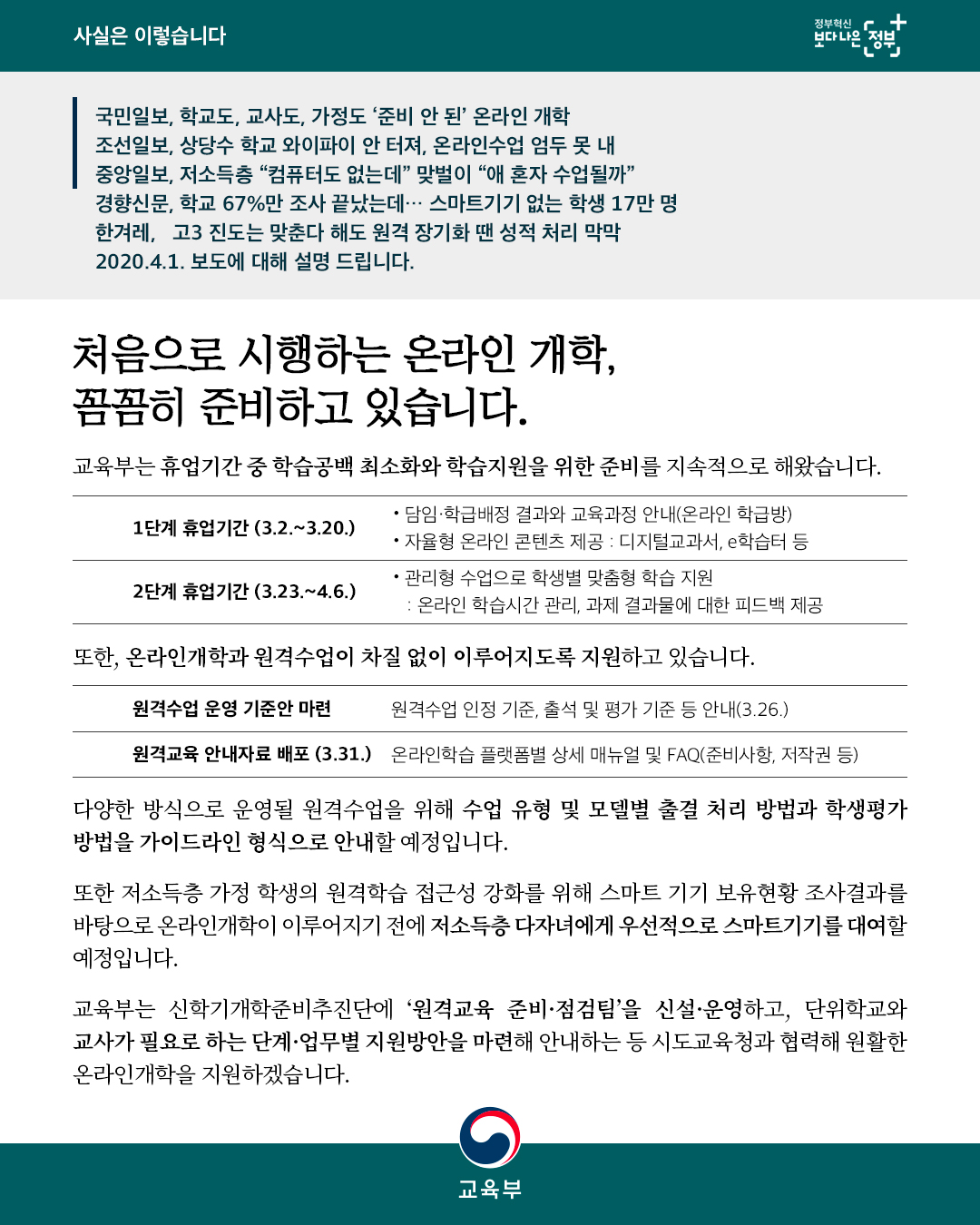 | 원격수업의 현장 안착을 위해 에듀테크 기업과 적극 협력합니다. (0) | 2020.04.02 |