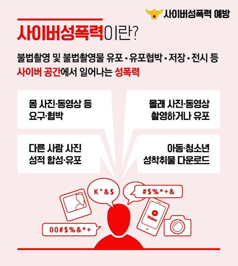 불법 촬영 및 불법촬영물 유포, 유포 협박, 저장, 전시 등은 모두 사이버 공간에서 일어나는 성폭력 범죄입니다.