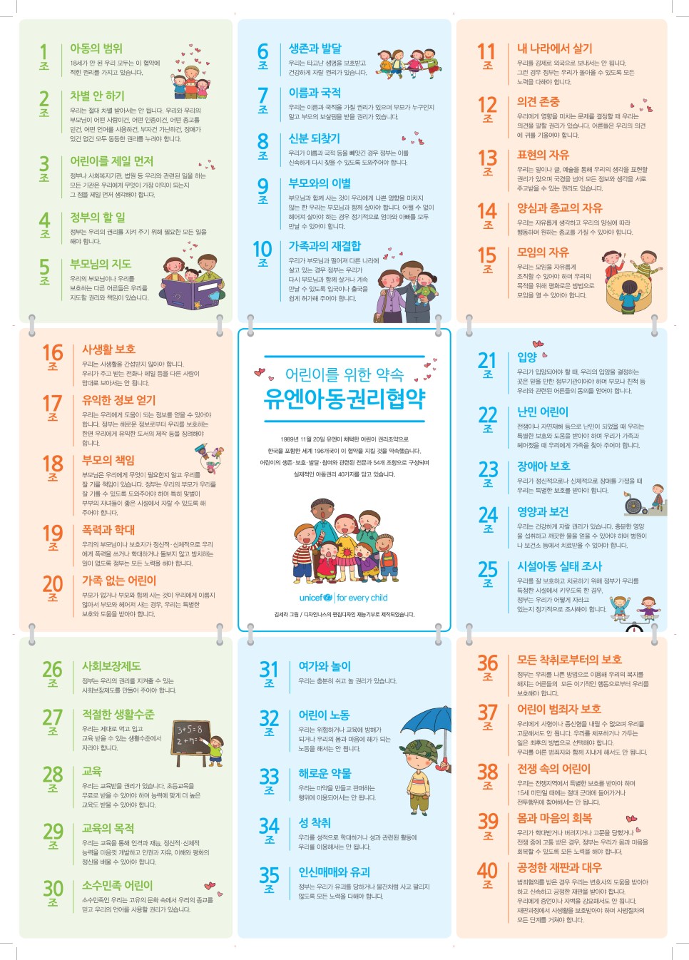 딱딱하게 느껴질 수 있는 조항들을 아동의 눈높이에 맞게 풀어쓴 포스터입니다. 전체 조항을 한눈에 보기 좋게 정리한 것이니까요. 아동을 교육하거나, 아동에게 유엔아동권리협약을 소개하고 싶을 때 활용하면 좋을 것 같습니다.