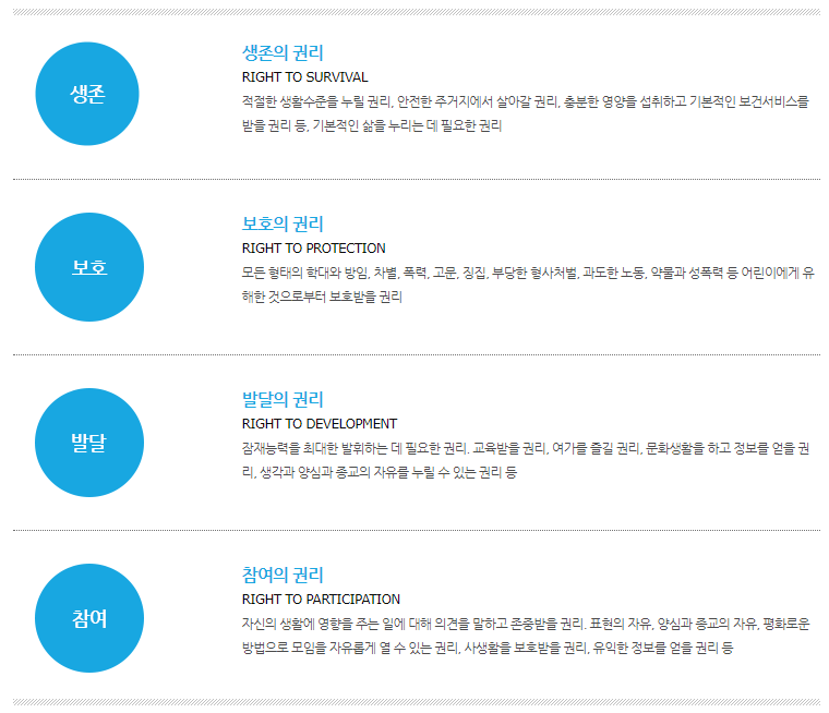 권리를 지닌 주체로 보고 이들의 생존, 발달, 보호, 참여에 관한