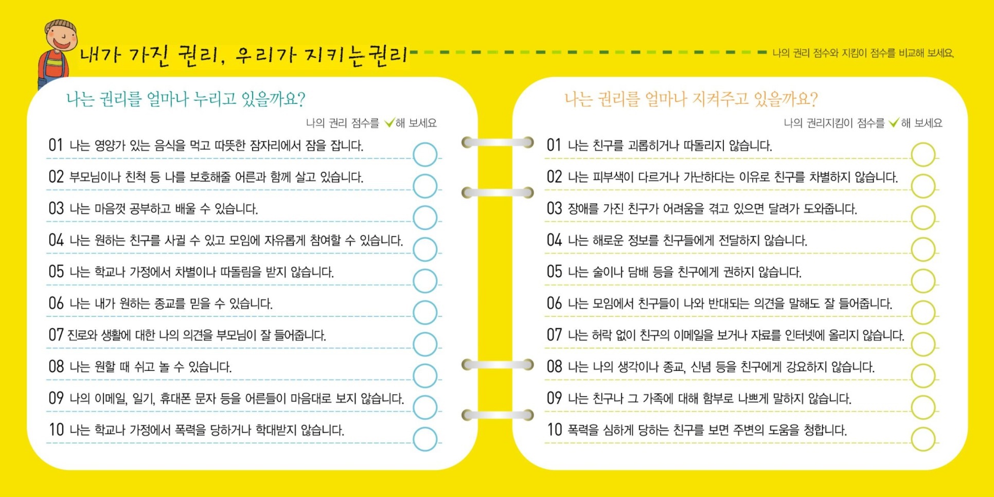 그림으로 보는 유엔아동권리협약 소책자에는 조금 더 다양한 내용이 포함되어 있는데요. 우선 전체 조항을 그림으로 표현해서 어린 아동들도 쉽게 이해할 수 있게 했습니다. 또한 유니세프의 활동과 유엔아동권리협약 소개, 아동이 직접 자가 테스트를 할 수 있는 페이지도 있어서요. 교육 현장에서 활용하기에도 좋을 것 같아요.