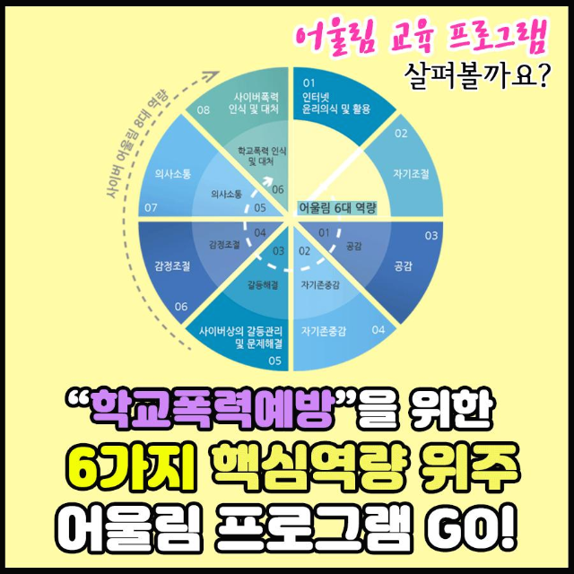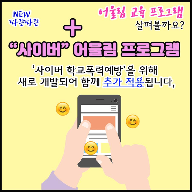 요즘 '사이버' 학교폭력의 심각성이 새롭게 대두된 만큼 "사이버 어울림 프로그램" 역시 새로 개발되어 추가 적용될 예정이라고 하는데요. 정말 어울림으로 하나가 된다면 학교폭력 없는, 가고 싶은 학교가 실현되겠죠? 벌써부터 기대가 됩니다!