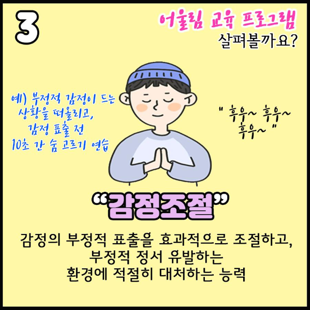감정조절은 감정의 부정적 표출을 효과적으로 조절하고 부정적 정서를 유발하는 환경에 적절히 대처하는 능력을 말합니다. 이 역량을 키우기 위해 부정적 감정이 드는 상황을 떠올리고, 감정 표출 전 10초 간 숨 고르기 연습을 하는 등의 활동을 할 수 있습니다.