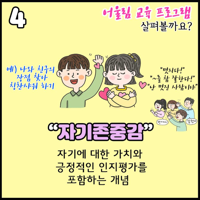 자기존중감은 자기에 대한 가치와 긍정적인 인지평가를 포함하는 개념을 말합니다. 자신에 대한 존중이 없다면 타인에 대한 존중도 없겠죠? 이 역량을 키우기 위해 "멋지다!", "~를 참 잘한다." 등 자신과 친구의 장점을 찾아 칭찬을 해주는 활동을 할 수 있습니다.