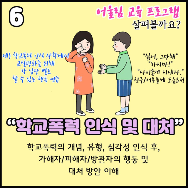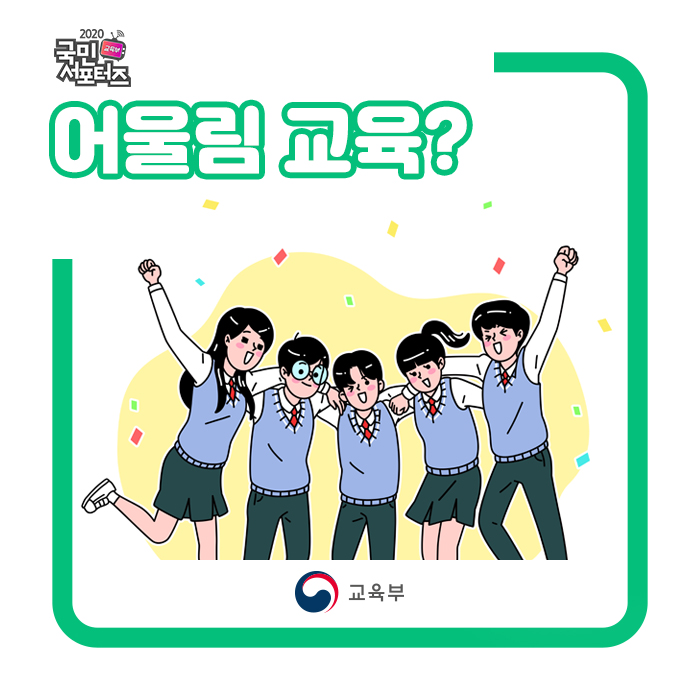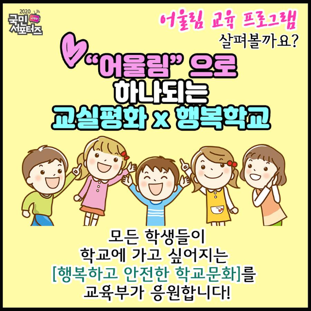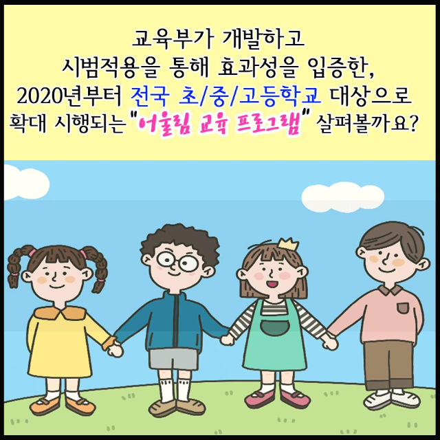 그래서 교육부가 준비했습니다! 2020년부터 전국 초/중/고등학교를 대상으로 확대 시행되는 어울림 교육 프로그램! 함께 살펴볼까요?