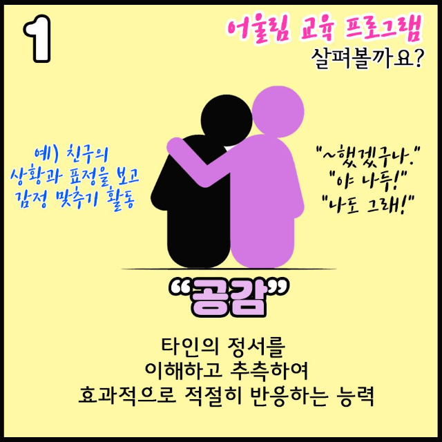 공감은 타인의 정서를 이해하고 추측하여 효과적으로 적절히 반응하는 능력을 말합니다. 인간관계를 맺음에 있어 가장 중요한 요소 중 하나인데요. "~했겠구나.", "나도 그래!" 등 친구의 상황과 표정을 보고 감정 맞추는 활동이 공감 역량을 키우는 데에 도움이 됩니다.
