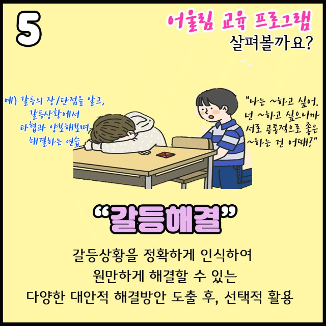 갈등해결 능력은 갈등상황을 정확하게 인식하여 원만하게 해결할 수 있는 여러 대안적 해결방안을 도출한 후 그것을 선택적으로 활용하는 능력을 말합니다. "나는 ~하고 싶어. 넌 ~하고 싶으니까 서로 공통적으로 좋은 ~를 하는 건 어때?"와 같이 갈등의 장단점을 알고, 갈등상황에서 타협과 양보해보며 해결하는 연습을 하는 활동을 통해 갈등해결 능력을 키울 수 있습니다.