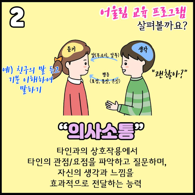 의사소통은 타인과의 상호작용에서 타인의 관점과 요점을 파악하고 질문하며 자신의 생각과 느낌을 효과적으로 전달하는 능력을 말합니다. 의사소통 역량을 키우기 위해 친구의 말을 듣고 기분 이해하여 말하도록 유도하는 것과 같은 활동을 하게 됩니다. 친구의 목소리, 말투, 표정, 몸짓, 손짓 등을 통해 친구의 생각을 파악하여 듣도록 하는 것도 좋겠죠?