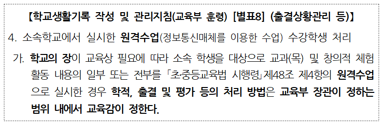 원격수업은 법령*상 학교장이 운영할 수 있는 수업의 한 형태이나, 등교수업과는 달리 그동안 출결․학적․평가에 대한 구체적 처리 기준이 마련되어 있지 않았기에, 이번 신학기 온라인개학을 앞두고 학교 현장의 요구를 반영하여 전국 공통의 지침을 마련하였다. 이번 지침을 바탕으로 각 시도교육청은 원격수업 운영 세부지침을 마련하고, 일선 학교는 교육부와 교육청의 지침을 학교 원격수업 운영 계획에 반영해 운영하게 된다.