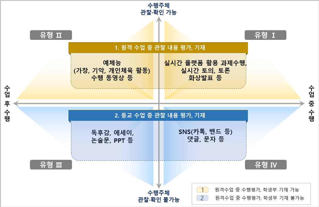 우선, 원격수업 중 또는 이후에 교사가 학생의 평가 과제 수행 모습을 관찰‧확인한 경우에는 원격수업 기간 중에도 수행평가와 학생부 기재가 가능하다. 화상수업 중 실시간 플랫폼(구글 문서(Docs) 등)을 활용하여 모둠별 토의 과제를 작성하거나, 화상 발표를 하는 경우(Ⅰ유형) 또는 가창, 기악 등 예체능 교과(목)의 수행평가 과제를 학생이 동영상으로 촬영하여 제출하는 경우(Ⅱ유형) 등이 이에 해당한다.