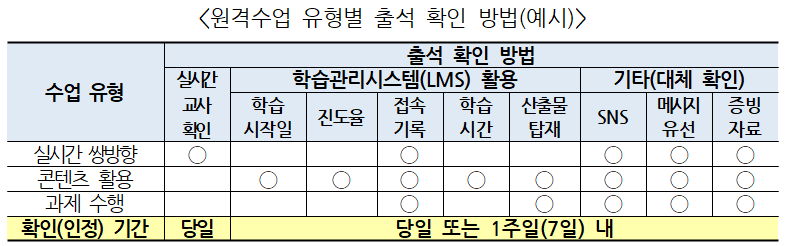 원격수업의 출결은 교과담당교사가 차시단위로 ‘출석’ 또는 ‘결석(결과)’으로만 처리하는 것을 원칙으로 한다. 교과담당 교사는 수업 당일 기준으로 담당 차시별 학생의 출결을 확인하여 이를 출석부 등 보조장부에 기록하고, 담임교사는 각 교과 담당교사의 출결기록 내용을 종합하여 교육행정정보시스템(NEIS)에 출결을 최종으로 처리한다. 다만, 등교수업과는 달리 원격수업의 출결은 수업일로부터 7일 이내에 출석이 확인된 경우, 담임교사가 사후에 증빙자료를 확인하여 출석으로 처리할 수 있도록 함으로써 교사의 출결관리 부담을 완화하였다. 또한, 원격수업 유형별(실시간 쌍방향, 콘텐츠 활용 중심, 과제 수행 중심 등) 출결 관리 방법과 대체 확인 방법을 안내하여 학교의 여건에 적합한 출결 관리가 가능하도록 하였다.