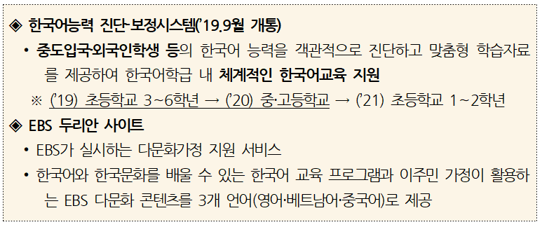 한국어능력이 부족한 다문화학생을 위해 온라인 교육 콘텐츠*를 활용할 수 있도록 안내하겠습니다. 아울러 한국어학급 담당교사를 통해 다문화학생의 한국어학습을 관리하고 지원하겠습니다. 또한, 중앙 및 시·도교육청 다문화교육지원센터와 연계하여 다국어 가정통신문을 제작·배포하는 등 다문화 가정에 대한 안내를 강화하겠습니다.