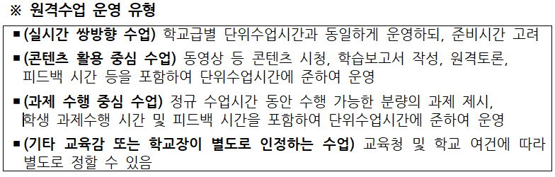 * 원격수업: 실시간 쌍방향 수업, 콘텐츠 활용 중심 수업, 과제 중심 수업 등