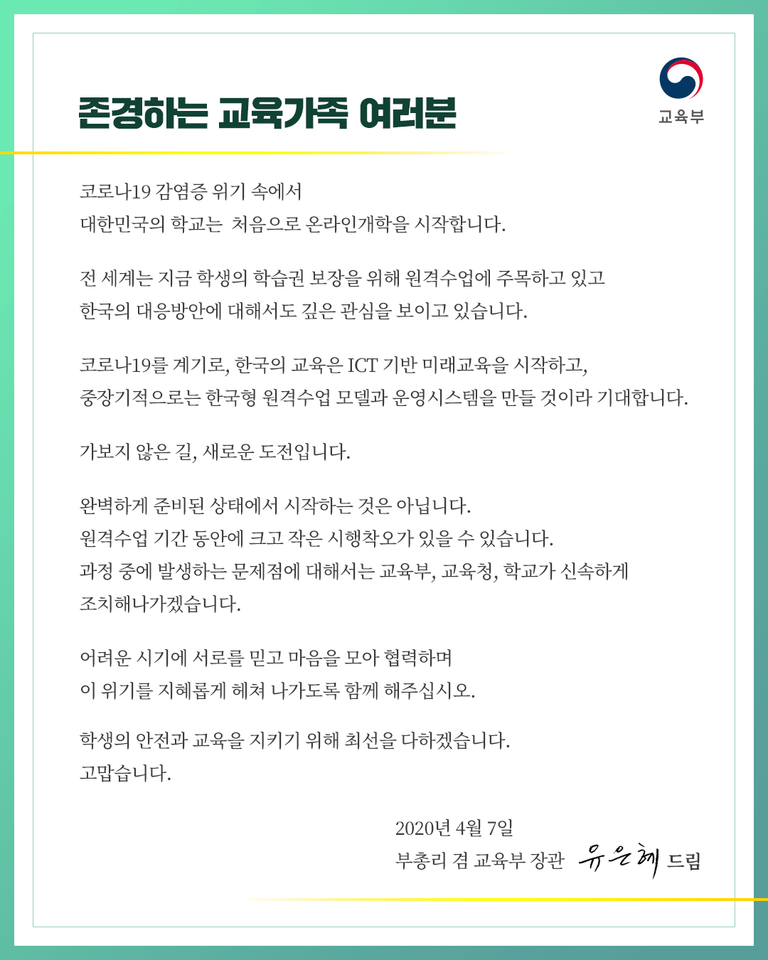 대한민국의 학교는 처음으로 온라인개학을 시작합니다.