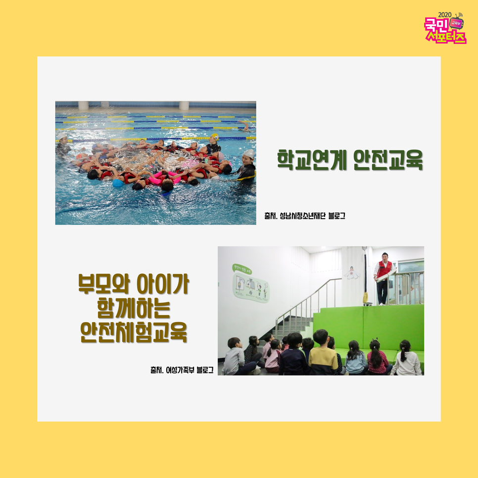현재 안전교육은 학교뿐 아니라 다양한 지역사회 기관 등에서 진행하고 있습니다. 특히, 지역사회 청소년기관의 경우 학교와 연계하여 생존 수영을 비롯한 다양한 안전교육을 진행하기도 하며 지역사회 안전체험관에서는 부모와 아이가 함께 안전체험교육을 신청해서 받아볼 수도 있습니다. 개인적으로 저 또한 지역사회 안전체험관에서 안전교육을 받으며 시민안전 파수꾼 과정을 수료하였는데요! 정말 안전체험관의 시설들이 실감 나게 재현되어 있고 더불어 많은 실제적인 지식들을 쌓을 수 있었던 기억이 있습니다! :)