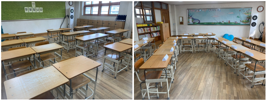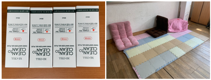 아이들이 자주 소독을 할 수 있게 개인손소독제와 전체 손소독제도 준비했습니다. 교실마다 아이들이 쉴 수 있는 공간을 마련하기도 합니다.