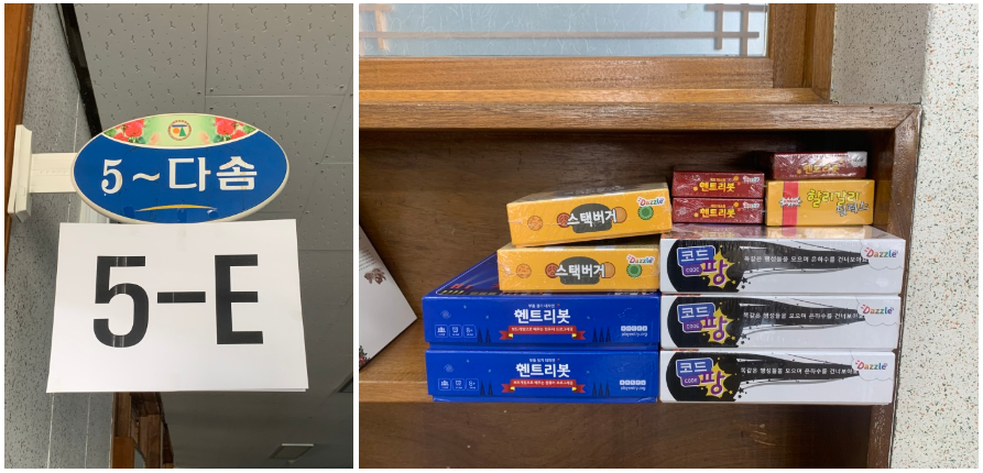 먼저 반편성을 해 아이들이 잘 찾아올 수 있도록 팻말을 붙입니다. 5-E반으로 배정되었던 학생은 올해 5학년 다솜반이 되었습니다. 아이들이 놀이시간에 선택할 수 있도록 보드게임도 따로 준비했습니다. 코딩교육과 관련된 보드게임이 많답니다.