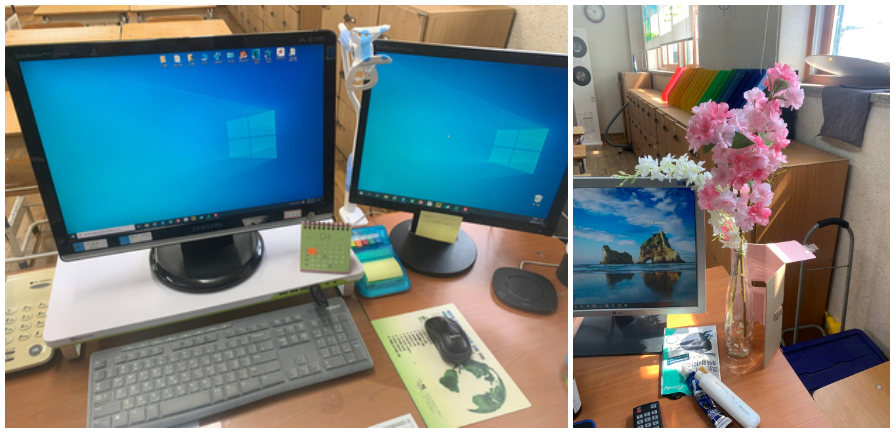 제 책상도 깨끗하게 정리를 합니다. 유일한 제 공간이기에 깔끔하게 정리를 합니다. 옆 반 선생님은 책상에 꽃을 두었네요. 아이들이 꽃을 보면서 봄이 왔음을 느낄 수 있을 것 같아요.
