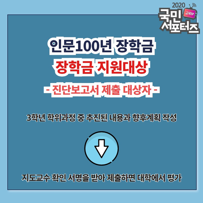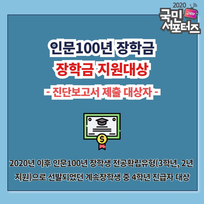 진단 보고서 제출 대상자도 있습니다. 진단 보고서 제출 대상자는 2020년 이후 인문 100년 장학생 전공 확립(3학년, 2년 지원) 유형으로 선발되었던 계속 장학생 중 4학년 진급자인데요. 진단 보고서 평가 결과에 따라 남은 1년간의 지원 여부가 결정되니 정말 중요하겠죠?