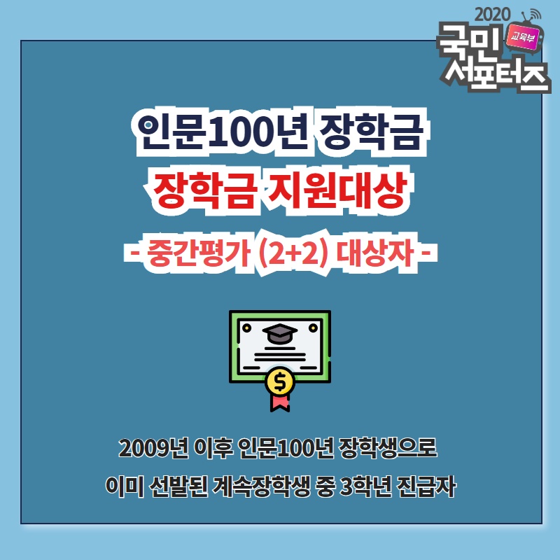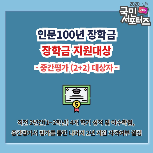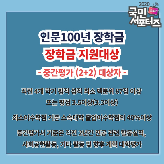 중간평가(2+2) 대상자도 있습니다. 중간평가(2+2) 대상자는 2009년 이후 인문 100년 장학생으로 이미 선발된 계속 장학생 중 3학년 진급자입니다.
