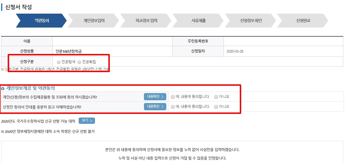 인문 100년 장학금 상세페이지가 나오면 오른쪽의 바에서 신청하기를 클릭해 주세요. 여기서 인문 100년 장학금을 찾아서 클릭하고 아래의 신청하기 버튼을 눌러주세요. 신청 구분을 정확하게 골라주시고 개인 정보제공 및 약관에 동의해 주세요. 전공탐색 유형은 1학년만 신청 가능하고 전공 확립 유형은 3학년만 신청 가능함에 주의하세요.