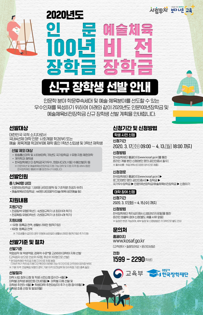 주목해야 할 것은 작년까지만 하더라도 인문 100년 500명, 예술체육 비전 140명 총 640명을 선발하다가, 올해 인문 100년 1,500명, 예술체육 비전 440명 총 1940명으로 장학생 선발 규모를 확대했다는 사실인데요. 이번 기회를 통해서 인문 100년 장학금에 대해 알아보고 지원해보는 것은 어떨까요?