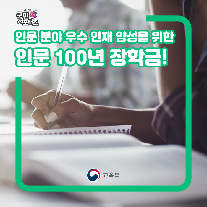 이 장학금은 2007년에 지방 인문계 장학생 사업, 지역 대학 우수 장학생 지원 사업을 신설하면서 생겨났는데요. 통합과 이관 과정을 거치다가 2015년 국가우수 장학금(인문사회계)의 명칭을 인문 100년 장학금으로 변경하면서 자리 잡게 되었습니다. 한국장학재단에서 만든 장학금으로 인문학 소양을 고루 갖춘 인재를 양성하고 지원함으로써 학문 후속 세대로 성장을 도모하는 데 의의를 두고 있습니다.