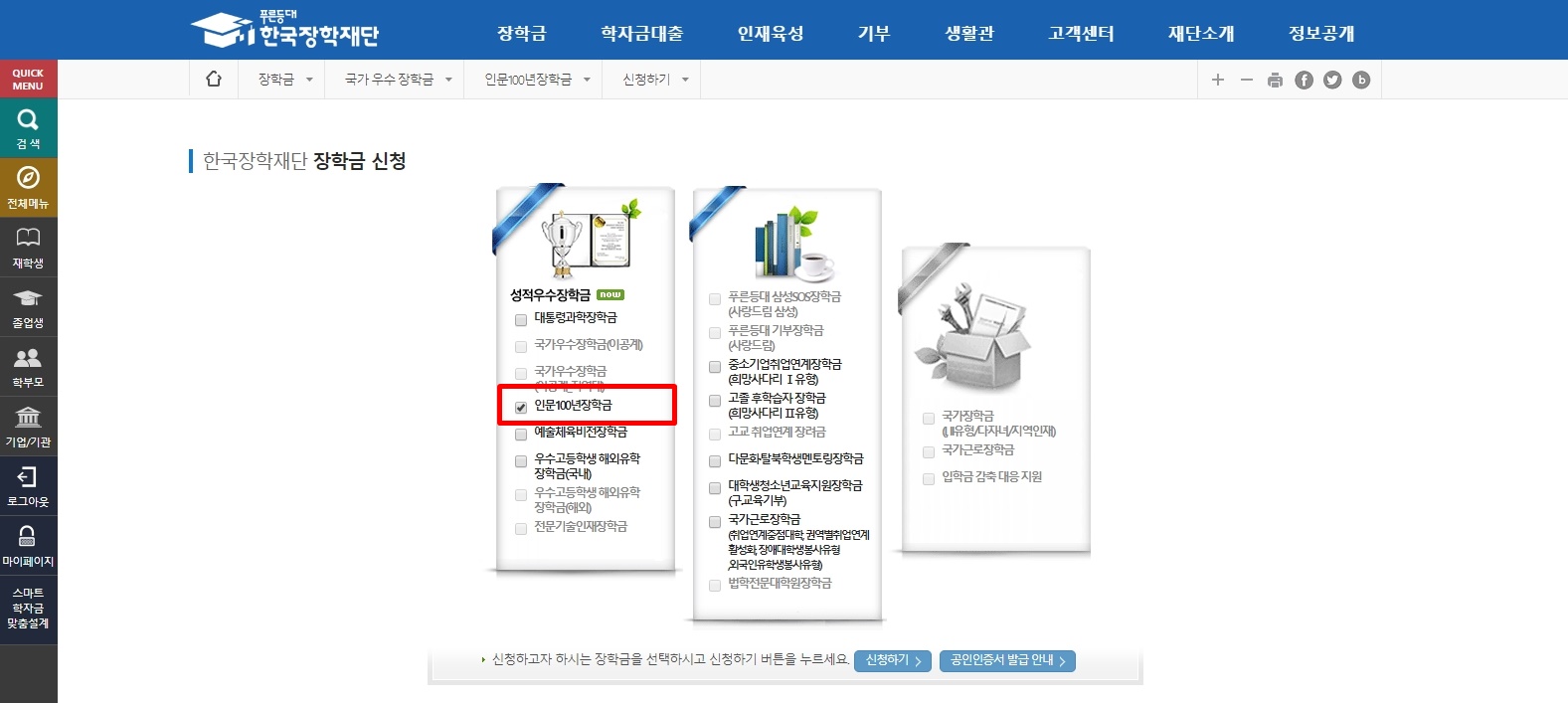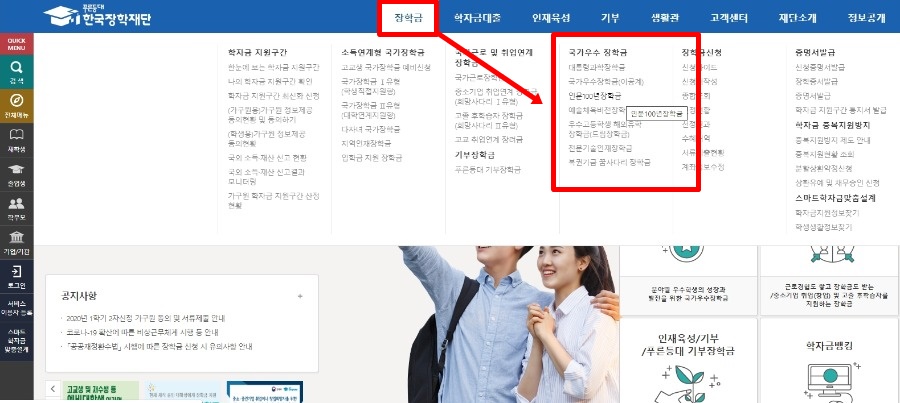 로그인 후, 로그인 버튼 아래에 있는 파란색 바에서 장학금에 마우스를 올립니다. 그럼 학자금 지원 구간, 소득연계형 국가장학금, 국가근로 및 취업연계 장학금, 기부 장학금, 국가우수 장학금, 장학금 신청, 증명서 발급 등의 칸들이 나옵니다. 여기서 국가우수 장학금에서 인문 100년 장학금을 찾아 클릭합니다.