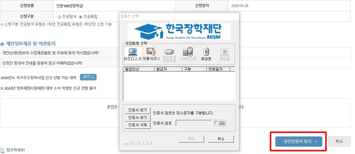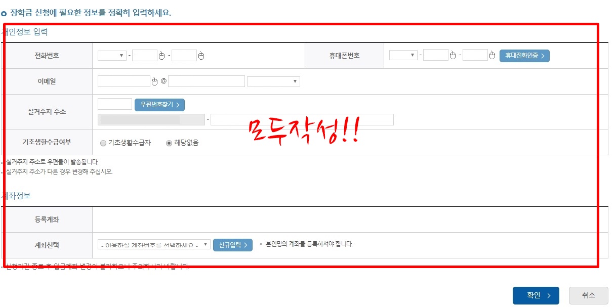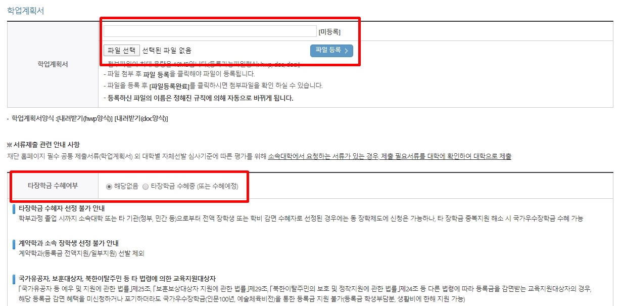 신청자 명의(학생 본인)의 공인인증서로 동의 버튼을 눌러주고요. 다음 페이지에서는 학생 본인의 전화번호 및 이메일, 거주 주소, 학생 본인 계좌를 입력해 주어야 합니다. 소속 대학과 학과/전공, 학번, 학년도 입력해 주세요. 학업계획서 파일을 업로드해주시고 타장학금 수혜 여부도 선택해 주세요. 만약 타장학금을 수혜 중이라면 다 장학금의 수혜 정보를 입력한 후 수혜 포기에 동의하면 됩니다.