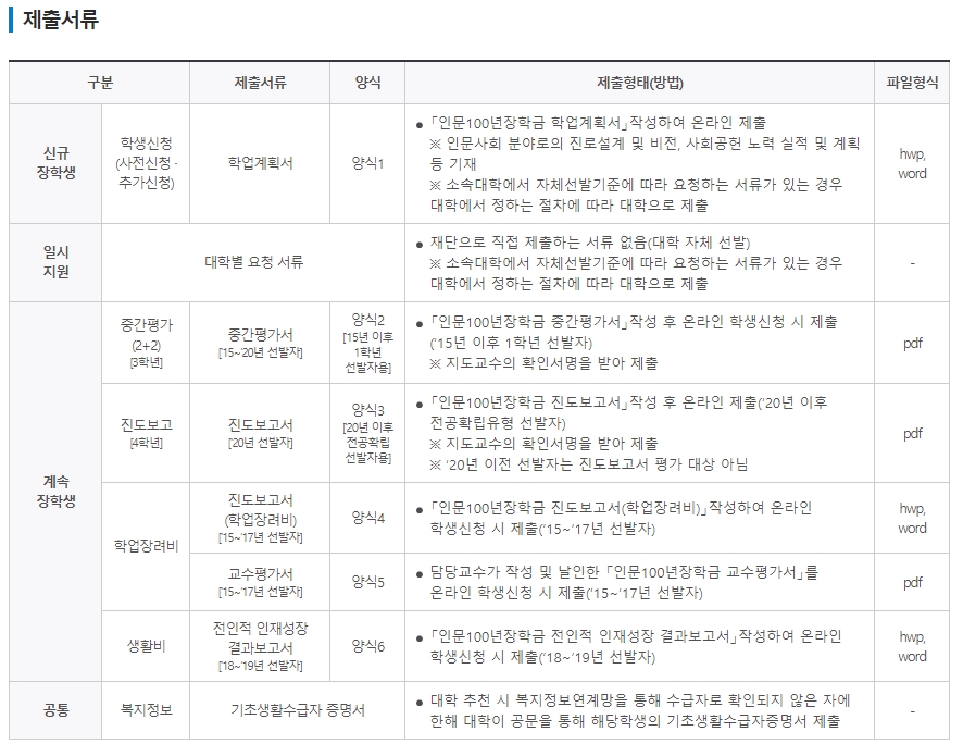 이번에는 인문 100년 장학금 제출서류를 살펴보도록 하겠습니다. 앞에서도 제출 서류에 대해서 이야기했지만 깔끔하게 한눈에 볼 수 있는 것이 좋겠죠? 신규 장학생의 경우는 학업계획서를 작성해서 제출해 주셔야 합니다. 일시 지원의 경우는 대학별 요청 서류가 필요합니다.