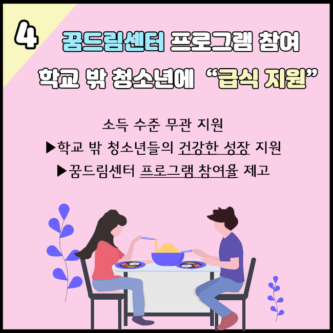 4. 꿈드림센터 프로그램에 참여중인 학교 밖 청소년들에게 급식 지원! (소득무관)