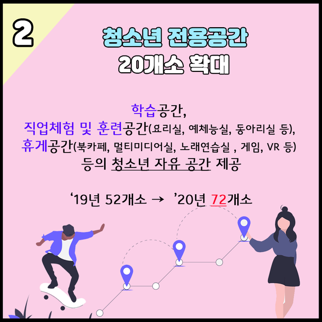 라고 생각하는 학교 밖 청소년을 위한 곳인 "청소년 전용공간"이 2020년에는 20개소를 확대하여 총 72개소가 됩니다. 공간의 확대로 더 많은 학교 밖 청소년들이 안전하고 즐겁게 생활할 수 있게 되었습니다.