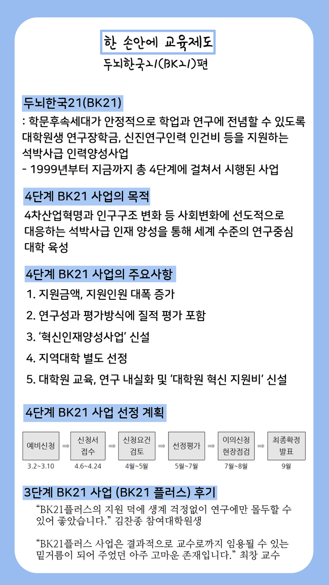 이처럼 우리나라의 대학원과 교수 그리고 대학원생을 지원하는 4단계 BK21 사업은 4월 6일부터 4월 24일까지 신청서 접수가 진행되며, 9월 중에 최종 확정 발표가 될 예정입니다. 앞으로의 대한민국 미래를 위한 새로운 연구 인력 양성에 많은 관심과 응원 부탁드립니다.