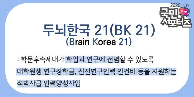 혹시 두뇌유출(Brain Drain)이라는 용어를 아시나요? 2010년대에 들어서 뉴스에서 종종 볼 수 있는 이 이 말은 국내의 전문 인력이나 인재가 해외로 유출되거나 자신의 전문능력과 관계없는 일에 종사하는 현상을 의미합니다. 고등교육 분야, 연구분야에서도 비슷한 사례가 있음은 이미 여러 논문이나 뉴스에서 지적된 바가 있는데요. 이러한 이유 때문에 국가 경쟁력을 제고하고 우수한 인재들이 국내에서 학업과 연구에 전념할 수 있도록 돕기 위한 정책이 필요합니다. 정부에서는 이와 관련하여 BK21을 추진하고 있습니다. 그렇다면 BK21은 무엇의 줄임말일까요?