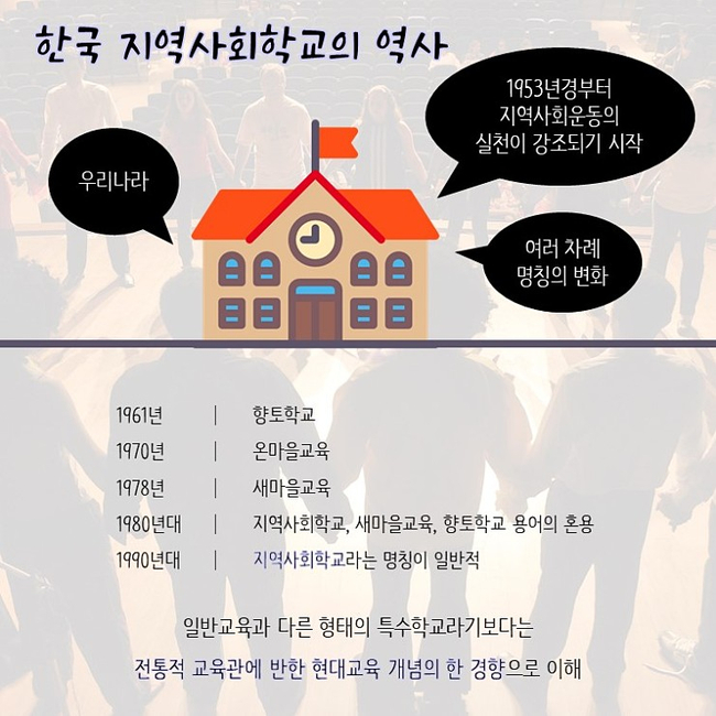 지역사회학교는 우리나라 교육의 역사에서도 찾아볼 수 있는데요. 여러 차례 명칭의 변화가 있었지만 기본적으로 전통적 교육관에 반한 현대교육 개념의 한 경향으로 이해할 수 있습니다.