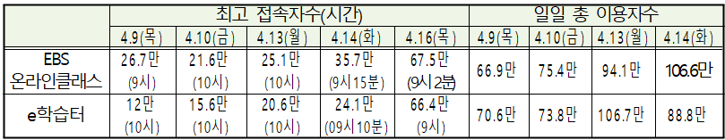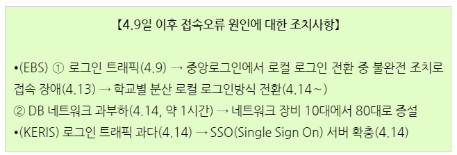 - (EBS) △분산형 로그인방식 전환(4.14~) △학생·교사 사용패턴에 따른 시스템 부하 테스트(4.14 22시~ 4.15 6:00) → 리소스(CPU 등) 증설, 기능 효율화 완료(4.15) △업로드 서버와 다운로드 서버 분리, 고성능 콘텐츠 저장소 추가(1PB → 2PB)(4.15)
