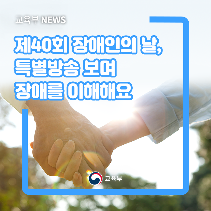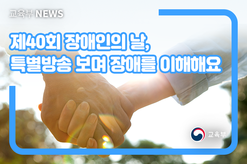 교육부(부총리 겸 교육부장관 유은혜)는 4월 20일(월) ‘제40회 장애인의 날’을 맞아 특별방송을 활용한 장애이해교육을 실시하고, 장애학생 교육에 헌신한 교원 등 유공자 117명을 표창한다. 특별방송은 장애인먼저실천운동본부, 삼성화재, KBS와 협업하여 2005년부터 매년 제작하는 장애이해교육 자료로, 각급 학교는 실시간 TV‧라디오 방송 또는 인터넷*에 배포된 방송 자료를 활용하고 있다.