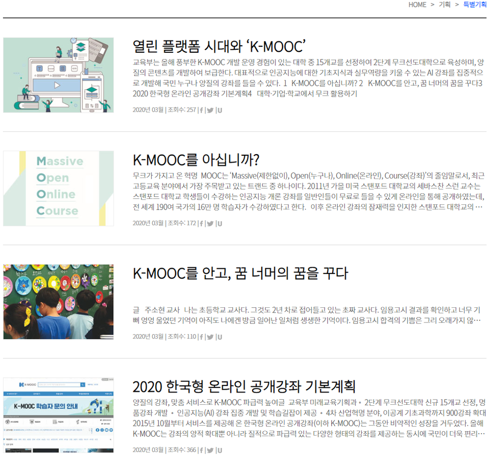 3월 호의 ‘기획’ 테마에서는 '열린 플랫폼 시대'와 ‘K-MOOC’를 다루었습니다. 특별기획은 하나의 큰 주제를 정한 후 그것을 다시 여러 소주제로 나누어 단계별로 이해할 수 있게 한 것인데요. 3월 호에서는 ‘K-MOOC’라는 큰 주제를 ‘K-MOOC’가 무엇인지, 현장에서 어떻게 활용되고 있는지, 열린 플랫폼 시대를 맞이하기 위한 교육부의 계획은 어떠한지, ‘K-MOOC’가 가지고 올 변화가 무엇인지를 총 4단계에 걸쳐 제시했습니다. 이렇게 소주제가 연관성 있게 제시되니 해당 교육사업이 현장에서 발휘할 수 있는 긍정적인 영향에 대해 더 잘 이해할 수 있었어요. 4월 호에서는 온라인 개학에 대한 모든 궁금증을 풀어준다고 하니, 학생은 물론 학부모님들도 관심을 갖고 읽어보시면 좋을 것 같아요.