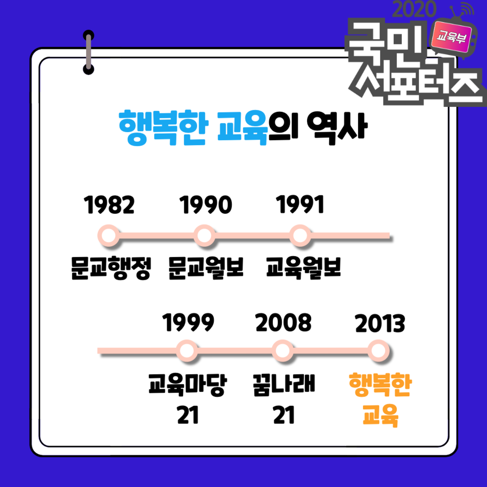 1982년 ‘문교행정’으로 첫 발행이 되었고, ‘문교월보’, ‘교육월보’, ‘교육마당21’, ‘꿈나래21’로 제목을 바꾸어오다 2013년 행복한 교육으로 새롭게 태어났습니다. 40년 가까운 시간 동안 교육소식을 국민들에게 전하는 중요한 역할을 진행해오고 있어요.