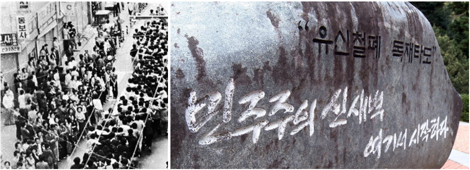4.19 혁명 이후 얼마 되지 않아 군사정부가 들어섰고, 1979년 10월 16일부터 20일까지, 부산과 마산에서는 군사정부의 독재에 대항하기 위한 투쟁이 벌어졌습니다. 그러자 정부는 즉각 비상계엄령을 선포하였고 군부대를 투입하여 시위를 무력 진압했습니다. 하지만 시위의 함성은 마산으로 번져나갔고, 시민들은 더욱 강렬하게 정부에 저항하며 우리나라의 민주주의를 요구했습니다. 이를 ‘부마항쟁’이라고 합니다.