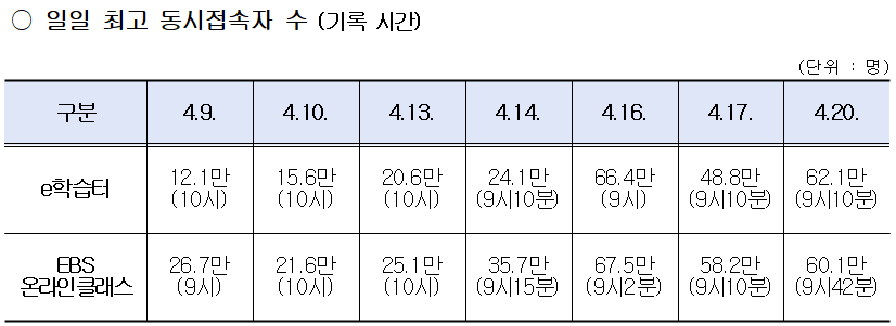 ※ EBS : 최고 접속자 수는 Google Analytics(실시간 활성 사용자 수) 산출 근거임