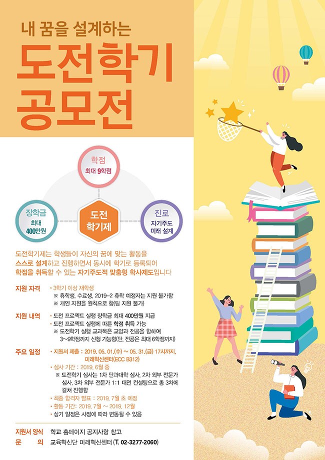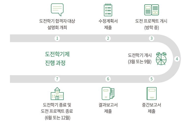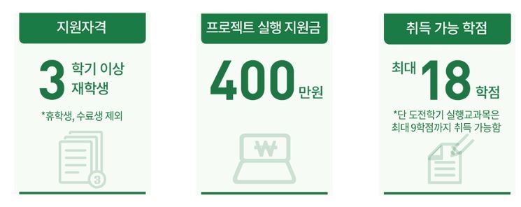 도전학기제는 서류심사와 면접으로 우수자를 선정한 후 활동에 따라 학기당 400만 원가량의 활동비를 지원해 주기도 합니다. 경제적 문제나 학점 문제 때문에 다양한 활동을 망설였던 학우들에게 큰 도움이 되겠죠? 또한 지도 교수님의 지도하에 프로그램을 진행하는 만큼 어려운 일이 있더라도 충분한 조언을 받으면서 활동을 진행할 수 있다는 것이 장점이죠.
